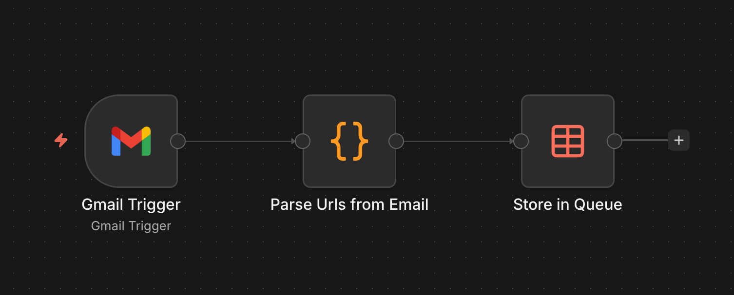 A Gmail trigger watches the inbox, parses any YouTube URLs out of the email body, and stores them in a Data Table for processing. I filter by sender so random spam doesn’t make it through — an allowlist is a must here.