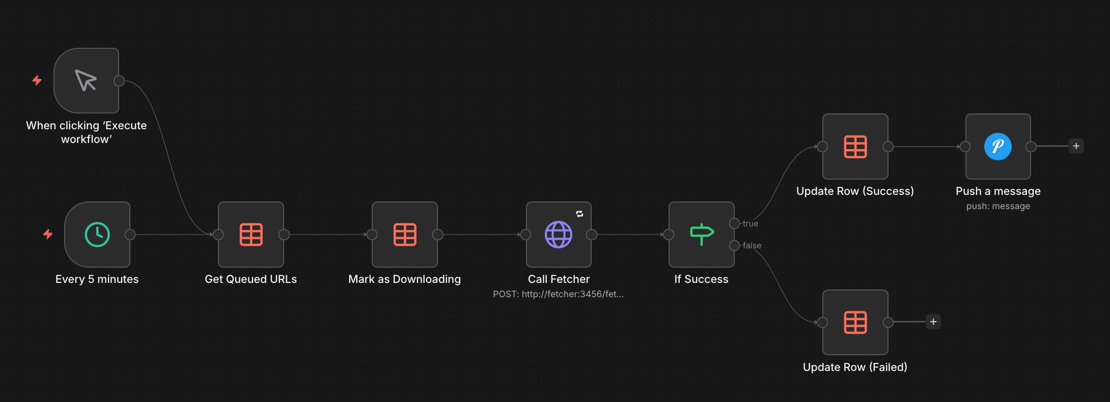 A second workflow runs separately and picks up queued URLs one at a time. I split this out because a single long-running workflow kept timing out or running into other wierd issues that were cumbersome to debug. This one marks each URL as “downloading,” calls yt-dlp via a small Python wrapper I wrote for Docker compatibility, then sends a Pushover notification when it’s done. Videos land in a NAS folder that Plex scans periodically.